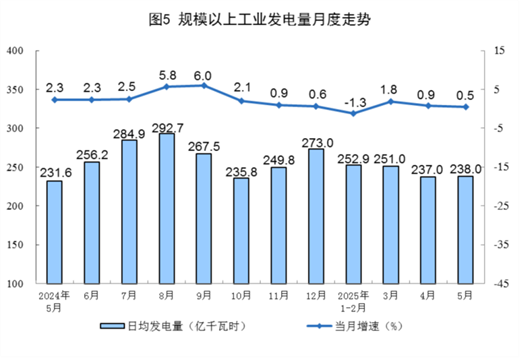 规上工业电力生产平稳增长。5月份,规上工业发电量7378亿千瓦时,同比增长0.5%,增速比4月份放缓0.4个百分点;日均发电238.0亿千瓦时。1—5月份,规上工业发电量37266亿千瓦时,同比增长0.3%,扣除天数原因,日均发电量同比增长1.0%。