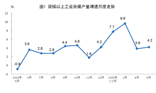 原煤生产增速加快。5月份,规上工业原煤产量4.0亿吨,同比增长4.2%,增速比4月份加快0.4个百分点;日均产量1301万吨。