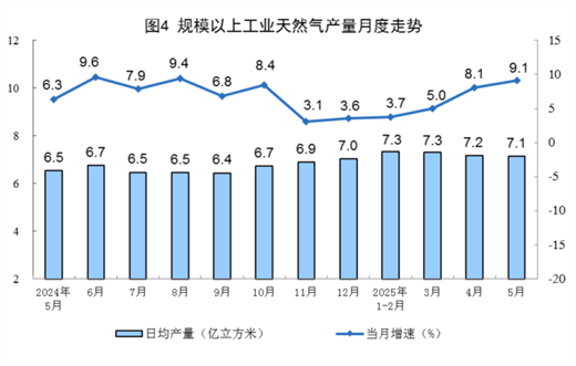 天然气生产增速加快。5月份,规上工业天然气产量221亿立方米,同比增长9.1%,增速比4月份加快1.0个百分点;日均产量7.1亿立方米。