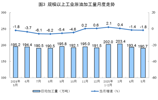 原油加工降幅扩大。5月份,规上工业加工原油5911万吨,同比下降1.8%,降幅比4月份扩大0.4个百分点;日均加工190.7万吨。