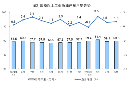 原油生产平稳增长。5月份,规上工业原油产量1847万吨,同比增长1.8%,增速比4月份加快0.3个百分点;日均产量59.6万吨。