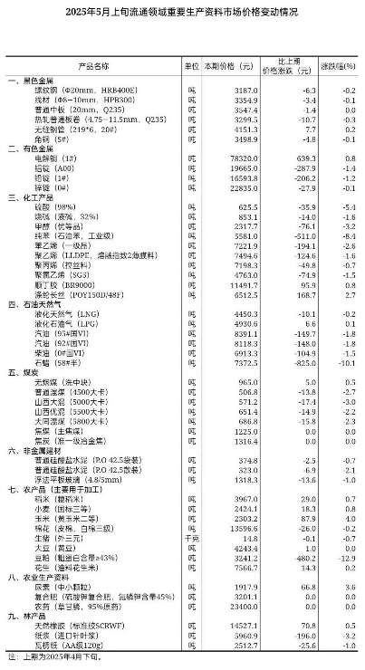 【数据发布】2025年5月上旬流通领域重要生产资料市场价格变动情况 日期: 2026-02-12 06:40 栏目:市场分析 浏览: 摘要5月上旬流通领域重要生产资料市场价格变动情况出炉,12种产品价格上涨,32种下降,6种持平。 中国统计信息服务中心 卓创资讯 据对全国流通领域9大类50种重要生产资料市场价格的监测显示,2025年5月上旬与4月下旬相比,12种产品价格上涨,32种下降,6种持平。 标签: 上一篇:【数据发布】2025年4月份能源生产情况 下一篇:数据 | 2025年4月内燃机行业销量综述 相关推荐 【权威解读】一季度规模以上工业企业利润由降转增 【数据发布】2025年1—3月份全国规模以上工业企业利润增长0.8% 【数据发布】2025年4月中国采购经理指数运行情况 【数据发布】2025年一季度全国规模以上文化及相关产业企业营业收入增长6.2%