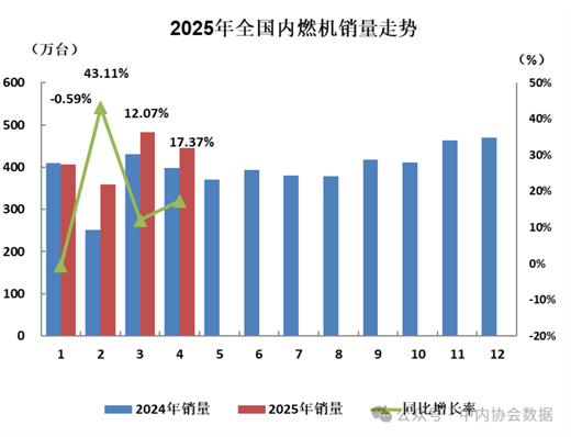 今年以来,我国经济呈现向好态势,社会信心持续提振,各种政策驱动下,内需潜力加快释放,内燃机整机市场较为活跃,销量同比及累计同比均呈增长态势。具体表现为:4月内燃机销量445.62万台,环比增长-7.88%,同比增长11.92%;1-4月累计销量1748.72万台,同比增长17.37%。