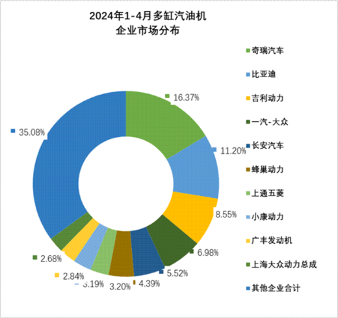 4月多缸汽油机销量164.81万台,环比增长-8.09%,同比增长3.38%;1-4月累计销量685.15万台,同比增长14.40%。在45家多缸汽油机企业中奇瑞、比亚迪、吉利、一汽-大众、长安汽车、蜂巢动力、上通五菱、小康动力、广丰发动机、上海大众动力总成销量排在前列,占总销量的64.92%。在销量较多的企业中,奇瑞、比亚迪、吉利、小康动力、上通五菱、上海大众动力总成销量增势表现突出。
