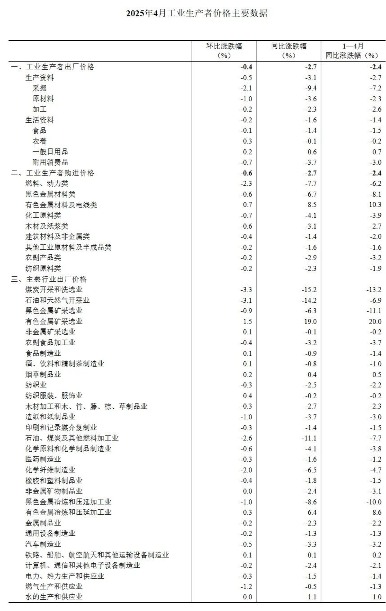 【机床商务网栏目 市场分析】2025年4月份,全国工业生产者出厂价格同比下降2.7%,环比下降0.4%;工业生产者购进价格同比下降2.7%,环比下降0.6%。1—4月平均,工业生产者出厂价格和购进价格比上年同期均下降2.4%。