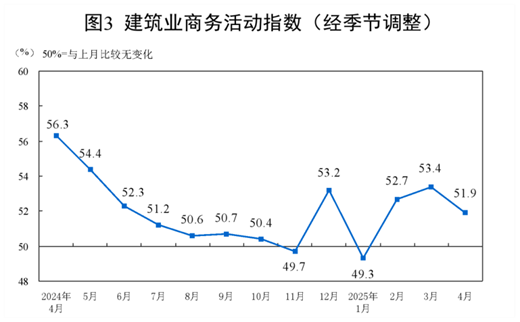 分行业看,建筑业商务活动指数为51.9%,比上月下降1.5个百分点;服务业商务活动指数为50.1%,比上月下降0.2个百分点。从行业看,航空运输、电信广播电视及卫星传输服务、互联网软件及信息技术服务、保险等行业商务活动指数均位于55.0%以上较高景气区间;水上运输、资本市场服务等行业商务活动指数均低于临界点。