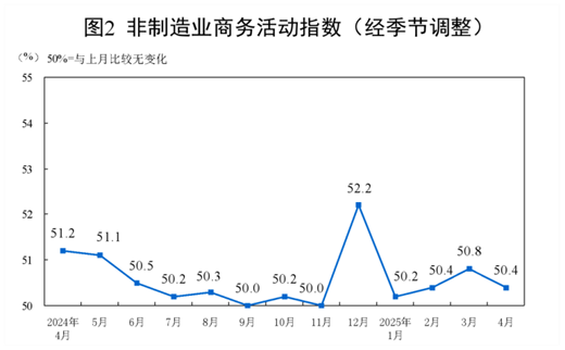 4月份,非制造业商务活动指数为50.4%,比上月下降0.4个百分点,仍高于临界点,非制造业继续保持扩张。
