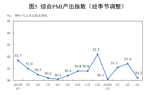 4月份,综合PMI产出指数为50.2%,比上月下降1.2个百分点,继续高于临界点,表明我国企业生产经营活动保持扩张。