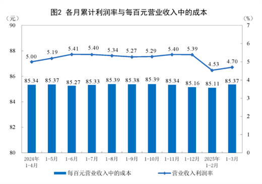 1—3月份,规模以上工业企业实现营业收入32.14万亿元,同比增长3.4%;发生营业成本27.44万亿元,增长3.6%;营业收入利润率为4.70%,同比下降0.12个百分点。
