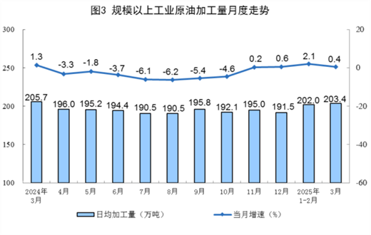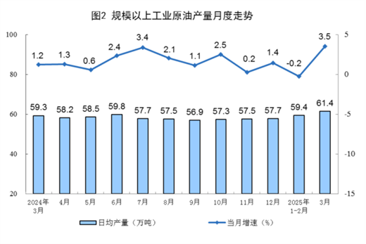 原油生产由降转增。3月份,规上工业原油产量1903万吨,同比增长3.5%,1—2月份为下降0.2%;日均产量61.4万吨。