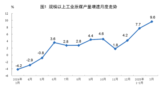 原煤生产增速加快。3月份,规上工业原煤产量4.4亿吨,同比增长9.6%,增速比1—2月份加快1.9个百分点;日均产量1421万吨。