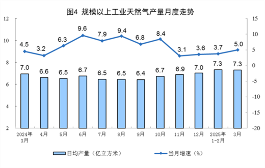 天然气生产稳定增长。3月份,规上工业天然气产量227亿立方米,同比增长5.0%,增速比1—2月份加快1.3个百分点;日均产量7.3亿立方米。