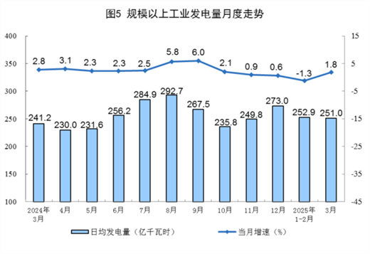 规上工业电力生产增速加快。3月份,规上工业发电量7780亿千瓦时,同比增长1.8%,增速比1—2月份加快3.1个百分点;日均发电251.0亿千瓦时。1—3月份,规上工业发电量22699亿千瓦时,同比下降0.3%,扣除天数原因,日均发电量同比增长0.8%。