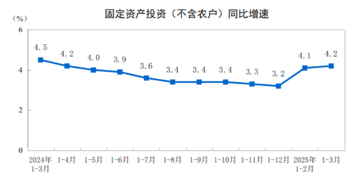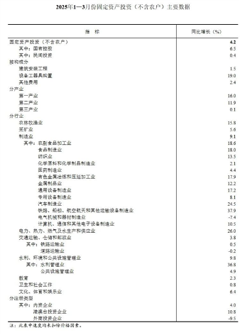 【机床商务网栏目 市场分析】2025年1—3月份,全国固定资产投资(不含农户)103174亿元,同比增长4.2%(按可比口径计算,详见附注7),增速比1—2月份加快0.1个百分点。其中,民间固定资产投资同比增长0.4%,增速加快0.4个百分点。从环比看,3月份固定资产投资(不含农户)增长0.15%。