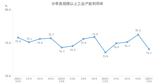 分三大门类看,2025年一季度,采矿业产能利用率为74.6%,比上年同期下降0.4个百分点;制造业产能利用率为74.1%,上升0.3个百分点;电力、热力、燃气及水生产和供应业产能利用率为73.6%,上升2.4个百分点。