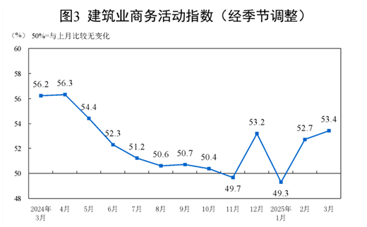 分行业看,建筑业商务活动指数为53.4%,比上月上升0.7个百分点;服务业商务活动指数为50.3%,比上月上升0.3个百分点。从行业看,水上运输、航空运输、邮政、电信广播电视及卫星传输服务、货币金融服务等行业商务活动指数均位于55.0%以上较高景气区间;餐饮、生态保护及公共设施管理、文化体育娱乐等行业商务活动指数均低于临界点。