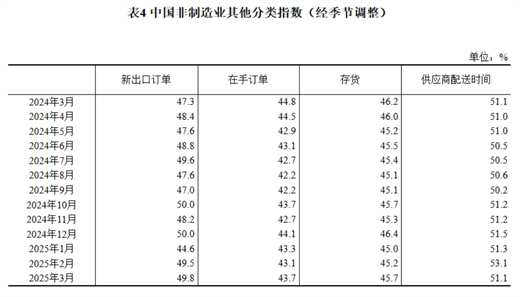 供应商配送时间指数为50.3%,比上月下降0.7个百分点,仍高于临界点,表明制造业原材料供应商交货时间持续加快。