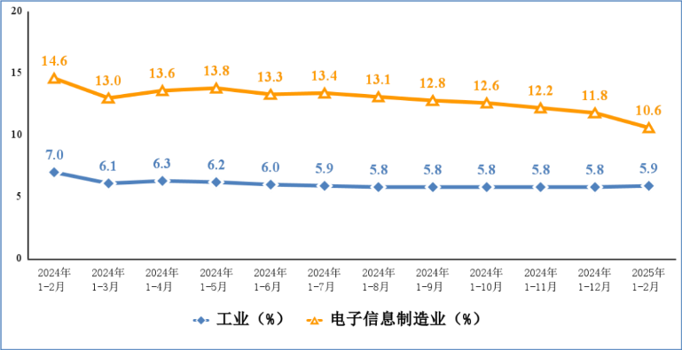 1—2月,电子信息制造业固定资产投资同比增长9.6%,较2024年回落2.4个百分点,比同期工业投资增速低1.9个百分点,比同期高技术制造业投资增速高9.6个百分点。