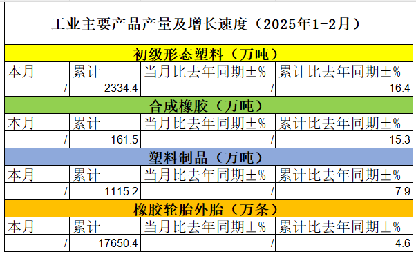 合成橡胶——2025年1-2月累计产量为161.5万吨,比去年同期增长15.3%。