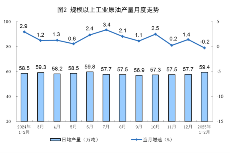 原油生产基本稳定。1—2月份,规上工业原油产量3504万吨,同比下降0.2%;日均产量59.4万吨。