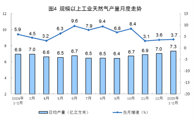 天然气生产稳定增长。1—2月份,规上工业天然气产量433亿立方米,同比增长3.7%,增速比上年12月份加快0.1个百分点;日均产量7.3亿立方米。
