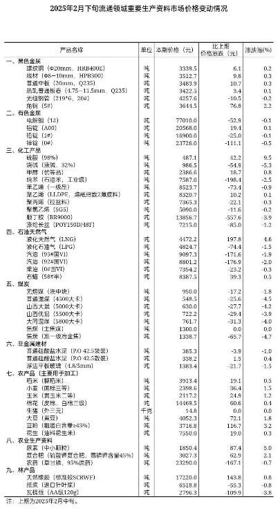 2025年2月下旬流通领域重要生产资料市场价格变动情况 日期: 2026-02-18 06:40 栏目:市场分析 浏览: 摘要2025年2月下旬流通领域重要生产资料市场价格变动情况。 【机床商务网栏目 市场分析】据对全国流通领域9大类50种重要生产资料市场价格的监测显示,2025年2月下旬与2月中旬相比,22种产品价格上涨,26种下降,2种持平。 标签: 上一篇:工程机械市场韧性凸显 2025年出口或迎“温和增长” 下一篇:2024年中国金属切削机床产量数据统计 相关推荐 市场分析|近五年来中国无人机行业的发展脉络与未来趋势 2024年机床及相关产品产量数据汇总 【JC35盘点】近期重要经济数据盘点(12月) 2024年机床工具行业经济运行情况