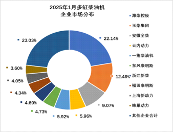 1月,多缸柴油机企业共销量33.84万台,环比增长5.28%,同比增长-11.56%。潍柴、玉柴、全柴、云内、一拖(含扬动)、东康、新柴、福康、上海新动力、蜂巢动力销量居前十名,占多缸柴油机总销量的76.97%;市场份额占比中:潍柴22.14%、玉柴12.49%、全柴9.07%、云内5.96%、一拖5.92%、东康4.73%、新柴4.69%、福康4.34%、上海新动力4.05%、蜂巢动力3.60%。