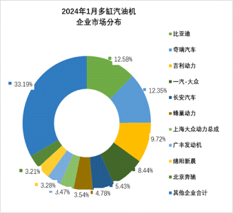 乘用车用在多缸汽油机占比为96.85%,1月销量149.32万台,环比增长-29.30%,同比增长-2.81%。比亚迪、奇瑞、吉利、一汽-大众、长安汽车、蜂巢动力、上海大众动力总成、广丰发动机、绵阳新晨、北京奔驰销量排在前列。