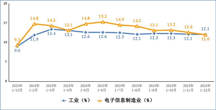 2024年,电子信息制造业固定资产投资同比增长12%,较1—11月回落0.6个百分点,比同期工业投资增速低0.1个百分点,比同期高技术制造业投资增速高5个百分点。