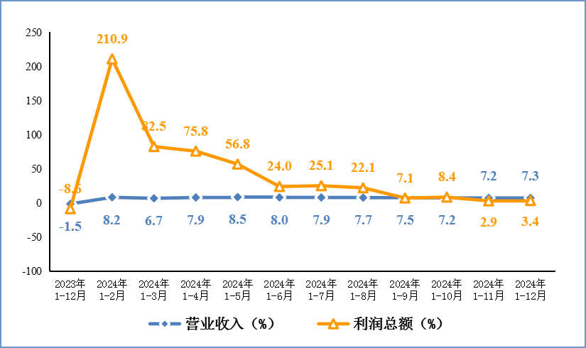 2024年,规模以上电子信息制造业实现营业收入16.19万亿元,同比增长7.3%;营业成本14.11万亿元,同比增长7.5%;实现利润总额6408亿元,同比增长3.4%;营业收入利润率为4.0%,较1—11月提高0.04个百分点。12月份,规模以上电子信息制造业营业收入1.74万亿元,同比增长8.4%。
