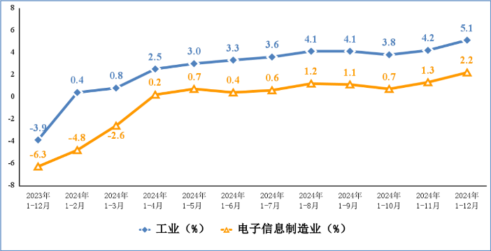 2024年,规模以上电子信息制造业增加值同比增长11.8%,增速分别比同期工业、高技术制造业高6个和2.9个百分点。12月份,规模以上电子信息制造业增加值同比增长8.7%。