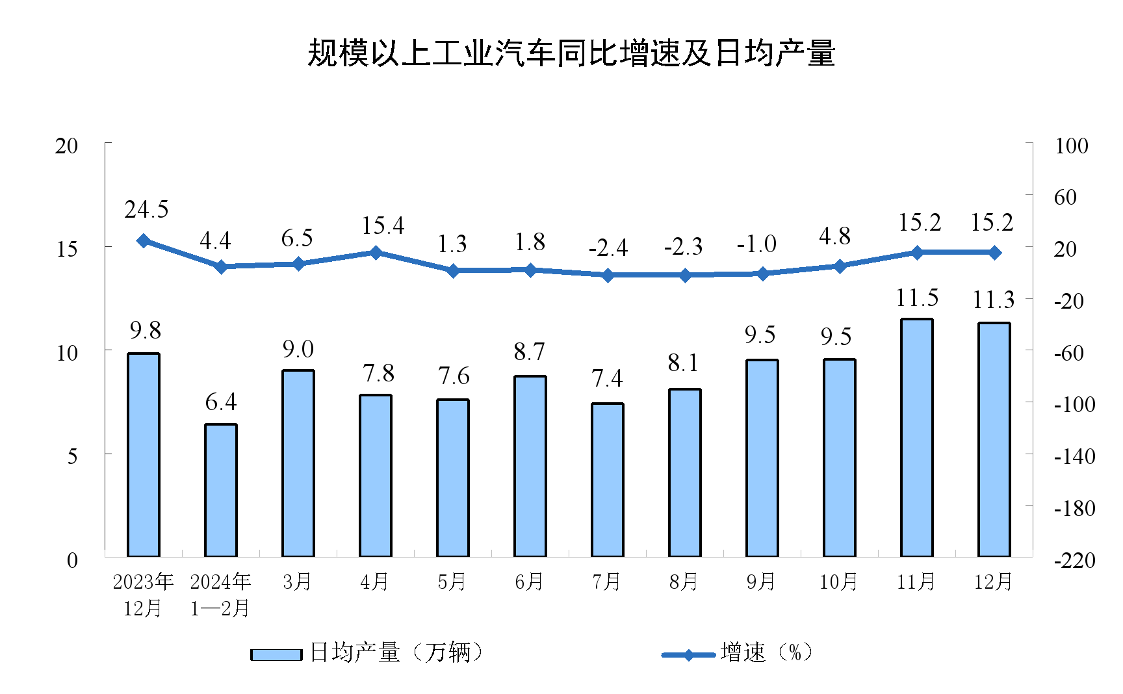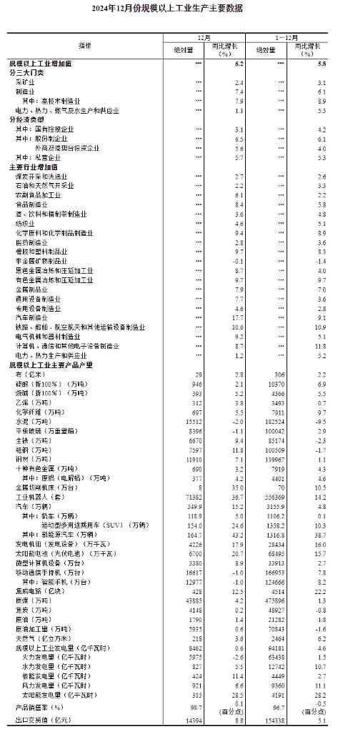 分产品看,12月份,规模以上工业619种产品中有396种产品产量同比增长。其中,钢材11910万吨,同比增长7.1%;水泥15512万吨,下降2.0%;十种有色金属690万吨,增长3.2%;乙烯312万吨,增长3.8%;汽车349.9 万辆,增长15.2%,其中新能源汽车164.7 万辆,增长43.2%;发电量8462亿千瓦时,增长0.6%;原油加工量5935万吨,增长0.6%。