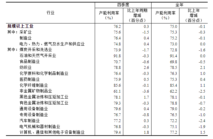 分主要行业看,2024年四季度,煤炭开采和洗选业产能利用率为73.9%,食品制造业为70.7%,纺织业为78.8%,化学原料和化学制品制造业为76.4%,非金属矿物制品业为61.1%,黑色金属冶炼和压延加工业为78.1%,有色金属冶炼和压延加工业为79.3%,通用设备制造业为79.6%,专用设备制造业为76.7%,汽车制造业为77.2%,电气机械和器材制造业为76.8%,计算机、通信和其他电子设备制造业为79.4%。