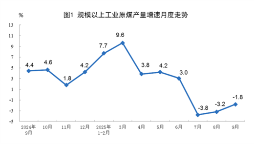 原煤生产降幅收窄。9月份,规上工业原煤产量4.1亿吨,同比下降1.8%,降幅比8月份收窄1.4个百分点;日均产量1372万吨。