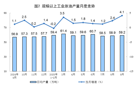 原油生产增速加快。9月份,规上工业原油产量1777万吨,同比增长4.1%,增速比8月份加快1.7个百分点;日均产量59.2万吨。