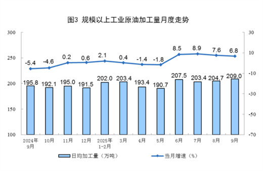 原油加工较快增长。9月份,规上工业原油加工量6269万吨,同比增长6.8%;日均加工209.0万吨。