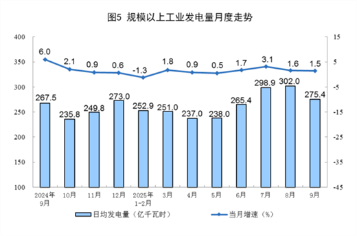 规上工业电力生产平稳增长。9月份,规上工业发电量8262亿千瓦时,同比增长1.5%;日均发电275.4亿千瓦时。1—9月份,规上工业发电量72557亿千瓦时,同比增长1.6%。