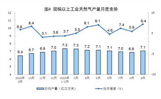 天然气生产增速加快。9月份,规上工业天然气产量212亿立方米,同比增长9.4%,增速比8月份加快3.5个百分点;日均产量7.1亿立方米。