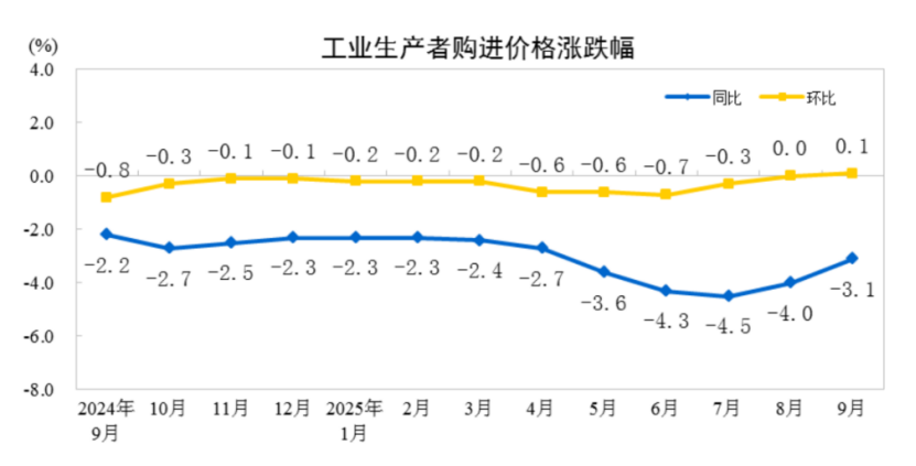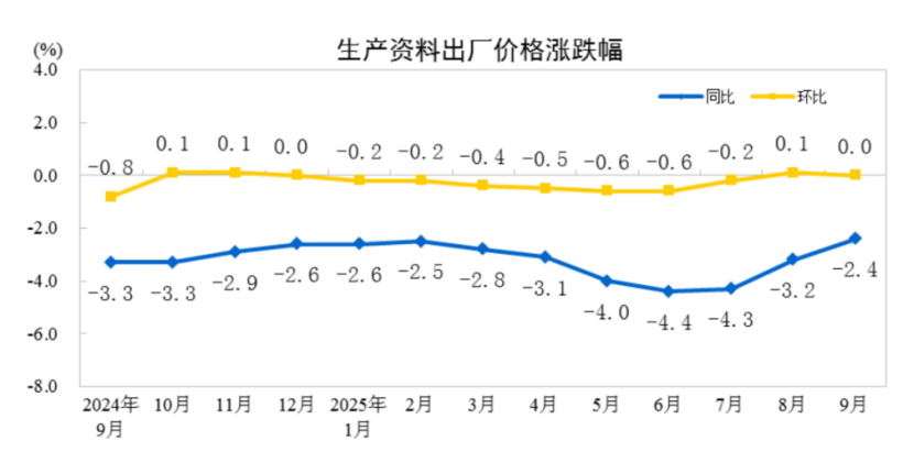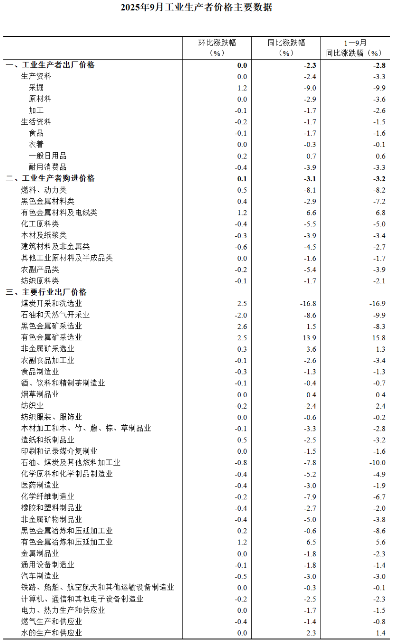 【机床商务网栏目 市场分析】2025年9月份,全国工业生产者出厂价格同比下降2.3%,降幅比上月收窄0.6个百分点,环比继续持平。工业生产者购进价格同比下降3.1%,降幅比上月收窄0.9个百分点,环比上涨0.1%。1—9月平均,工业生产者出厂价格比上年同期下降2.8%,工业生产者购进价格下降3.2%。