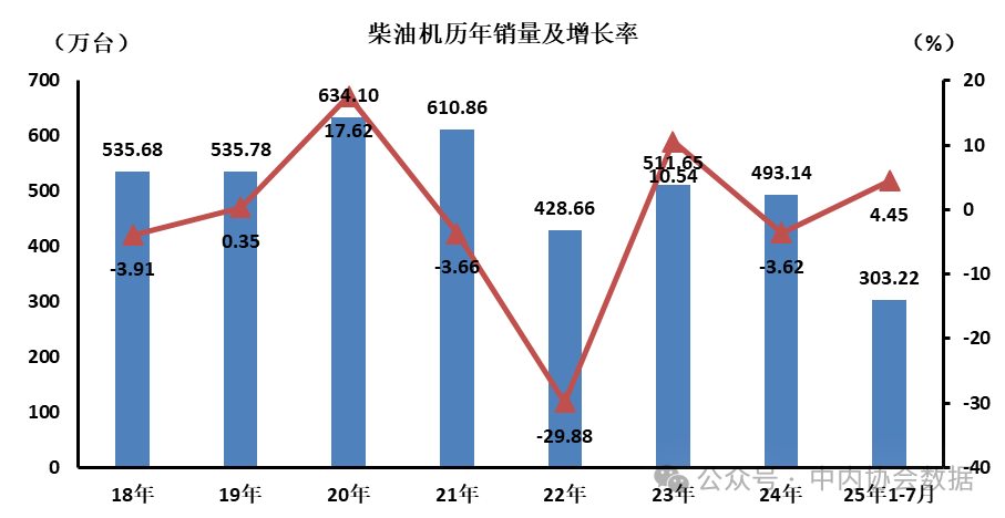 1-7月全国柴油内燃机累计销量303.22万台,同比增长4.45% 日期: 2026-03-01 06:40 栏目:市场分析 浏览: 摘要2025年7月,柴油内燃机销售36.72万台,环比增长-11.39%,同比增长6.68%。 【机床商务网栏目 市场分析】据中国内燃机工业协会统计分析,2025年7月,柴油内燃机销售36.72万台,环比增长-11.39%,同比增长6.68%;1-7月累计销量303.22万台,同比增长4.45%。 标签: 上一篇:2025年7月机床及相关产品产量数据简报 下一篇:2025年1-7月机床工具行业经济运行简讯 相关推荐 2025年1-7月全国电力市场交易电量同比增长3.2% 【数据发布】2024年经济发展新动能指数增长14.2% 2025年7月部分地区金属切削机床产量统计 2025年7月经济运行数据发布 总体势头良好
