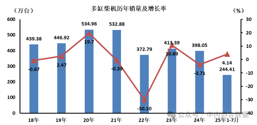 7月数据 | 多缸柴油机历年销量及增长率 日期: 2026-03-01 06:40 栏目:市场分析 浏览: 摘要2025年7月,多缸柴油内燃机销售28.92万台,环比增长12.30%,同比增长6.14%;1-7月累计销量244.41万台,同比增长4.14%。 【机床商务网栏目 市场分析】据中国内燃机工业协会统计分析,2025年7月,多缸柴油内燃机销售28.92万台,环比增长12.30%,同比增长6.14%;1-7月累计销量244.41万台,同比增长4.14%。销量靠前的企业为潍柴、玉柴、云内、全柴、新柴、东风康明斯、江铃、解放动力、蜂巢动力、新动力科技。 标签: 上一篇:【权威解读】8月份制造业采购经理指数小幅回升 非制造业商务活 下一篇:2025年7月经济运行数据发布 总体势头良好 相关推荐 2025年1-7月全国电力市场交易电量同比增长3.2% 【数据发布】2024年经济发展新动能指数增长14.2% 2025年7月部分地区金属切削机床产量统计 2025年7月经济运行数据发布 总体势头良好