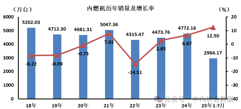 7月数据 | 内燃机历年销量及增长率 日期: 2026-03-02 06:40 栏目:市场分析 浏览: 摘要1-7月累计内燃机销量2964.17万台,同比增长12.50%。 【机床商务网栏目 市场分析】据中国内燃机工业协会统计分析,2025年7月,内燃机行业销量435.39万台,环比增长4.14%,同比增长14.28%;1-7月累计销量2964.17万台,同比增长12.50%。 标签: 上一篇:海外市场 | 2025上半年美国机械订单总额增幅较大 下一篇:【行业数据】前7月机械工业生产、投资保持增长态势 相关推荐 7月数据 | 内燃机历年销量及增长率 【行业数据】前7月机械工业生产、投资保持增长态势 【数据发布】2025年1—7月份全国规模以上工业企业利润下降1.7% 海外市场 | 2025上半年美国机械订单总额增幅较大