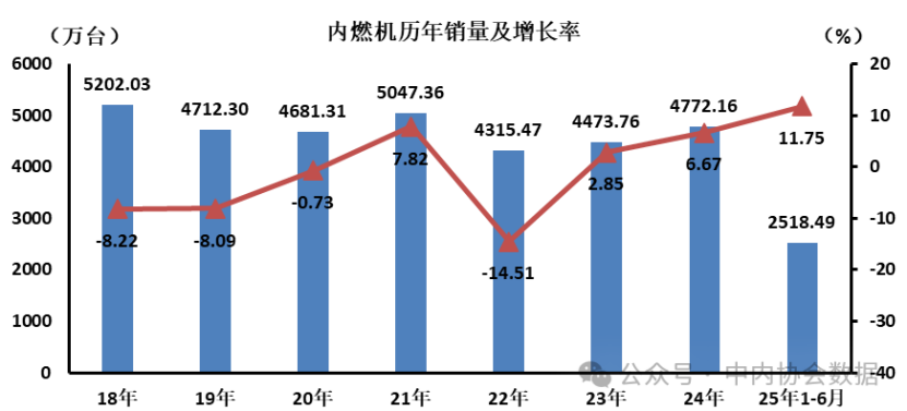 6月内燃机历年销量及增长率 日期: 2026-03-06 06:40 栏目:市场分析 浏览: 摘要2025年6月,内燃机行业销量418.10万台,环比增长3.38%,同比增长6.24%。 【机床商务网栏目 市场分析】据中国内燃机工业协会统计分析,2025年6月,内燃机行业销量418.10万台,环比增长3.38%,同比增长6.24%;1-6月累计销量2518.49万台,同比增长11.75%。 标签: 上一篇:【数据发布】2025年二季度全国规模以上工业产能利用率为74 下一篇:从CIMT2025看工业机器人技术发展及未来展望 相关推荐 【数据发布】2025年6月份居民消费价格同比上涨0.1% CIMT2025部分激光加工及增材制造设备评述 2025年1-5月我国铸件出口情况 【数据发布】2025年6月份工业生产者出厂价格同比下降3.6%
