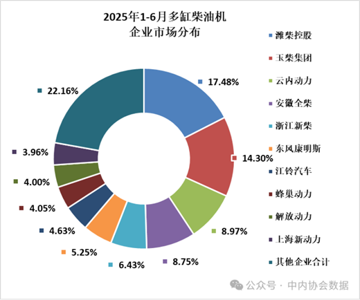 6月,多缸柴油机企业共销量32.97万台,环比增长3.28%,同比增长9.74%;1-6月累计销量215.41万台,同比增长3.84%。潍柴、玉柴、云内、全柴、新柴、东康、江铃、蜂巢动力、解放动力、新动力科技销量居前十名,占多缸柴油机总销量的77.84%;市场份额占比中:潍柴17.48%、玉柴14.30%、云内8.97%、全柴8.75%、新柴6.43%、东康5.25%、江铃4.63%、蜂巢动力4.05%、解放动力4.00%、新动力科技3.96%。
