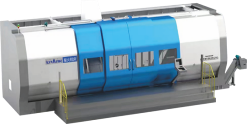 重庆机床(集团)有限责任公司VHL4035正倒立式数控车床,最大工件回转直径φ600mm,最大工件直径φ420mm,最大工件长度450mm;立式/倒立式主轴最高转速2500 r/min,快移速度24m/min;五轴四联动正倒立式数控车床,采用立式主轴和倒立式主轴垂向对置、双径向进给水平移动、双轴向进给垂向移动、伺服双面加工W轴的复合式布局,实现高效高精度车削加工。