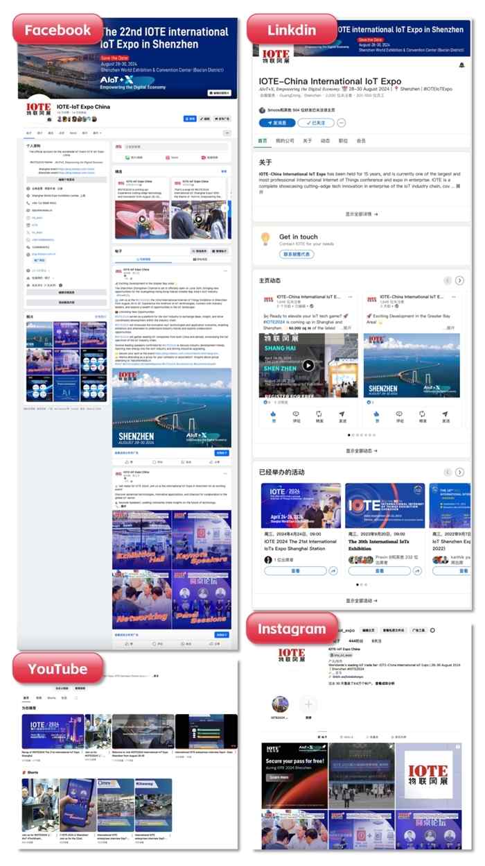 为了更好地与全球观众互动,IOTE国际物联网展在Facebook、LinkedIn、Instagram、TikTok和YouTube 等主流社交媒体平台上均有布局。我们通过这些平台分享最新的展会信息、技术动态和行业见解,吸引了大量的关注和讨论。无论你身在何处,都可以通过这些渠道了解IOTE物联网展的最新动态。