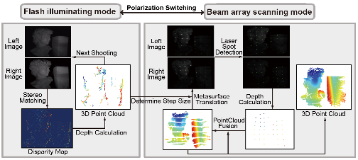 此外,研究团队基于光束调控器件构建了一套双模态激光雷达系统与自适应三维重建方案。系统首先工作在闪光模式下,快速完成整场景的快照式三维探测,获取目标边界形貌与复杂度信息。该初步数据为后续扫描模式中的步进策略提供依据,使系统能够根据实际目标特征智能选择扫描分辨率。在波束扫描阶段,系统可灵活执行粗略或精细的定向扫描任务,兼顾整体效率与局部细节。该系统通过偏振态驱动实现两种模式间的灵活切换,在保证全局快速探测的同时精确捕捉目标关键特征,突破了传统单一激光雷达在效率与精度之间互相矛盾的性能瓶颈。