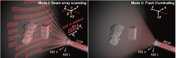 通过控制入射光的偏振态,即可实现两种光束覆盖模式间的灵活切换:左旋圆偏振光对应点阵扫描模式,级联超表面间±100μm微小相对面内平移可实现±35°二维视场的高准直点阵光束扫描,改变位移步长可动态调整分辨率,适用于高精度、远距离的三维扫描任务;右旋圆偏振光对应闪光模式,通过一次性照亮整个视场,可实现瞬时三维成像。