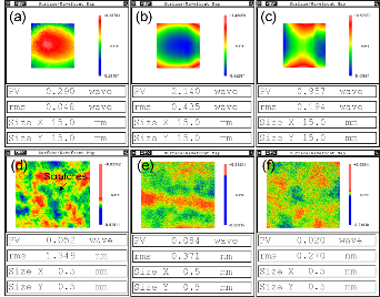 图3 面形结果:(a) 初始表面;(b) 激光单面抛光表面;(c) 激光双面抛光表面。粗糙度结果:(d) 初始表面;(e) 激光单面抛光表面;(f) 激光双面抛光表面。