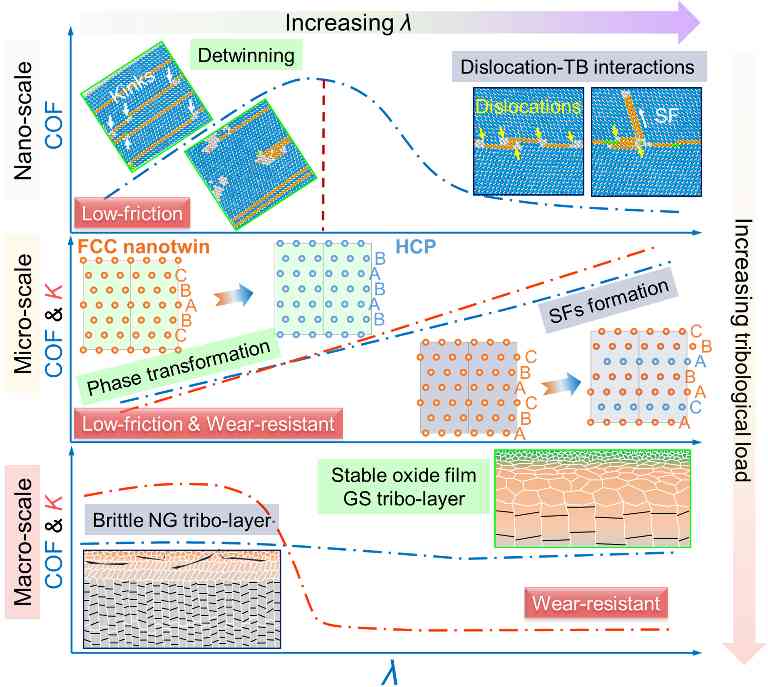 纳米孪晶(Nanotwinned,NT)金属因其高密度孪晶界(Twin boundaries,TBs)和纳米尺度孪晶片层厚度(λ),展现出优异的机械强度、结构稳定性、电导率和损伤容限。最近20年,纳米孪晶金属的研究已从初期的性能表征,发展到揭示突破传统标度律和新型变形机制。例如,当孪晶片层厚度小于某一临界值时,纳米孪晶Cu的拉伸变形机制由位错在孪晶界处塞积转变为不全位错诱导的孪晶界迁移与退孪生,从而表现出Hall-Petch软化现象,即强度随片层厚度减小而降低。相反,在纳米孪晶Ni中,由于孪晶界稳定性增强,导致位错持续塞积以及变形过程形成二次孪生,其压缩强度/硬度随孪晶片层厚度减小而持续上升。摩擦和磨损是造成材料性能退化和能量耗散的重要因素,全世界三分之一的能量以各种形式消耗在摩擦磨损上,不仅取决于接触界面特性,也与材料的宏观力学响应密切相关。然而,摩擦加载诱导的塑性变形远比单轴加载更为复杂,且受外部加载尺度的影响,这导致揭示摩擦加载下孪晶片层厚度依赖的标度律及变形机制面临严重挑战。因此,迫切需要建立全尺度(不同摩擦加载量级)下孪晶片层厚度依赖的摩擦磨损标度律,以期为不同摩擦学工况下纳米孪晶金属的性能调控提供理论依据。